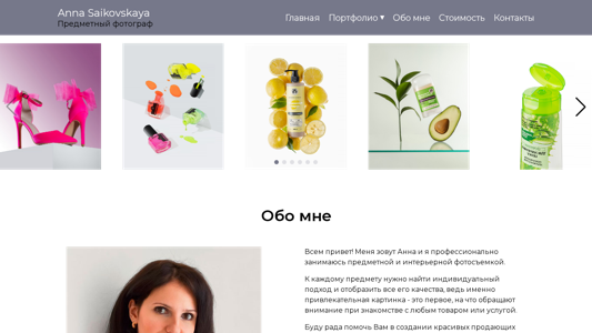 | AI-анализ | The portal predmetka.by is a professional photography website specializing in product and interior photography. The website belongs to Anna Saikovskaia, who offers her services for various online marketplaces, websites, and social media platforms. The homepage features a warm welcome greeting and a call to action to view her portfolios for product and interior photography. The former includes images of clothing, footwear, perfumes, cosmetics, and other merchandise for e-commerce stores and marketplaces. The latter showcases professional photography of real estate, architectural designs, and interior decor. Copyright © Anna Saikovskaia, 2023. |