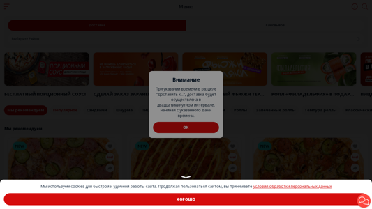 | SEO-описание | Закажите еду с доставкой в Витебске — пицца, роллы, шаурма, вок, паста, салаты и многое другое. Доставка на дом за 49 минут. Самовывоз. Удобный онлайн-заказ, акции и бонусы каждый день. |