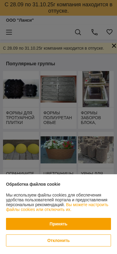 | AI-анализ | The portal lansi.by is an e-commerce website for a company named "OOO Ланси" that offers contacts, products, and services related to concrete and polymer products for construction and landscaping. During the period from September 28 to October 31, 2025, the company is on vacation. The website showcases various forms for trotuar paving, including polyurethane forms, trays for stones and tiles, and forms for concrete blocks, balusters, sculpters, and park barriers. There are also sections for flower pots, skimmer boxes, and various decorative elements made of metal and concrete. The website offers a wide range of products under the categories of trotuar paving forms, polyurethane forms, concrete blocks and balusters, and decorative elements. The contact information for the company is provided on the website, |