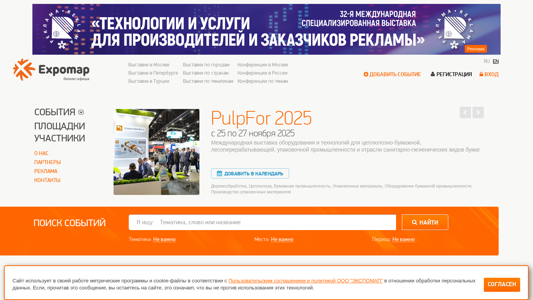 | AI-анализ | The portal Expomap is a business events calendar featuring exhibitions, conferences, and seminars. It provides announcements and business breakfasts for entrepreneurs and networking opportunities. The comprehensive list of business events aims to help increase a company's clean profit in the 2025-2026 period. The website uses metric programs and cookie-files according to the User Agreement and UtiloMap LLC's data processing policy. By staying on the site, users agree to this usage. Events include those in Moscow, Russia, and other countries, as well as by theme, such as UtiliCon 2025, focusing on communal services, construction, and city management, or PulpFor 2025, dedicated to cellulose, paper industry, and packaging materials. MITEX 2025 covers building equipment, woodworking, furniture production, and industrial equipment. InterCHAR |