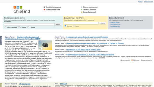 | AI-анализ | --- This online resource, ChipFind.ru, is an electronic components and radio parts search system connecting users to online inventories and price lists from suppliers. It offers a documentation archive and compatibility tables for components. The website includes a search engine for electronic components across 3115 stockists in Russia, Ukraine, and international suppliers, with options for availability, pricing, documentation, and analogs. Users can access recent news in the industry, contacts, a catalog, and a notice board for buying and selling radio components. The website features a macro group section showcasing a compact infra-red thermal imaging module, Fireye-V3, from FIBERT. Key features of Fireye-V3 include a non-cooled VOx microbolometer sensor, 640 × 512 resolution with 12 μm pixel size, low noise equivalent temperature difference (NETD) |