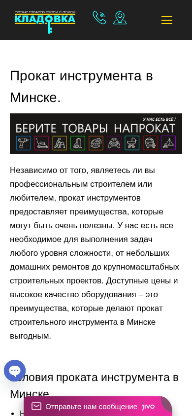 | AI-анализ | --- The portal Kladowka.by offers instrument rental in Minsk with a large selection at affordable prices. Whether you are a professional builder or a home hobbyist, renting tools provides valuable benefits. The company has all the necessary equipment for tasks of any complexity, from small home repairs to large-scale construction projects. Affordable prices and high-quality equipment are advantages that make renting building tools in Minsk an attractive option. The rental service is available to both physical and legal entities, ensuring optimal solutions for personal or corporate needs. Simply contact the company using the phone number provided on the site. |