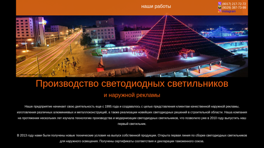 | AI-анализ | The portal stylend.by is a Belarusian website specializing in the production and sale of outdoor lighting fixtures and advertising solutions. The company, which began operations in 1995, offers a range of aluminum and metal structures, as well as the latest LED lighting solutions for the construction industry. Stylend.by has been studying the technology of LED lighting production and modernization for several years, enabling it to launch its first LED light in 2010. In 2013, the company obtained new technical specifications for manufacturing its own products and opened a production line for assembling outdoor LED lights. The company's production and storage facilities are located within the Minsk circular road, equipped with bending, milling, and laser machines, a painting and polymer coating shop, welding and other equipment. The company continues to focus on its production orientation, resulting in a |