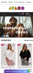 | AI-анализ | This online resource is an e-commerce website named Avaro, specialized in selling fashion clothing for women. The title of the website is "Avaro — Интернет-магазин модной одежды | Актуальные коллекции", which translates to "Avaro — Women's Fashion Online Store | Current Collections". The description reads "Avaro — это стиль, качество и уверенность" which means "Avaro — Style, Quality, and Confidence". The website offers free delivery and fitting. The top words associated with the website are "byn" (47 times), "размеры" (size or dimensions, 24 times), and various fashion items such as "костюм", "платье", and "блузки", each appearing around 6 times. The website sells various brands |