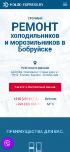 | AI-анализ | The web project "Holod-Express.by" is a repair service for refrigerators and freezers based in Bobruisk and Osiopovichy, Belarus. The website's title is "Ремонт холодильников и морозильников в Бобруйске, Осиповичах", and its description includes keywords related to repair and replacement of various parts such as compressors, motors, and condensers. The top words indicate a focus on quick repair and various models of refrigerators and freezers. The contact information provides phone numbers for both Bobruisk and Osiopovichy locations, along with mentions of quick repair and service for various districts. The website offers benefits such as repair of any refrigerator or freezer model, long-term experienced technicians, quick repair times, and a written quality guarantee. The pricing for various repairs |