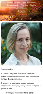 | AI-анализ | The portal "Lilia Gladkova | Psychologist" is a website dedicated to Lilia Gladkova, a psychologist and body-oriented therapist who uses the Feldenkrais method. She believes that everyone has a great potential that deserves realization: the potential for creative activity that brings fruit and deep satisfaction; the potential for loving relationships; the potential for sexuality, which brings pleasure and unites body and soul; the potential for inner and outer wealth and enjoyment of life. She invites visitors to a safe and attentive space where they can find paths to their development and expression together. The website offers information about Lilia's services, blog, bio-synthesis, and Feldenkrais method, as well as her biography and pricing information. Visitors can contact her through email or various messaging apps. The website is registered under the legal name of IP Gladkova Liilia Eduardovna with |