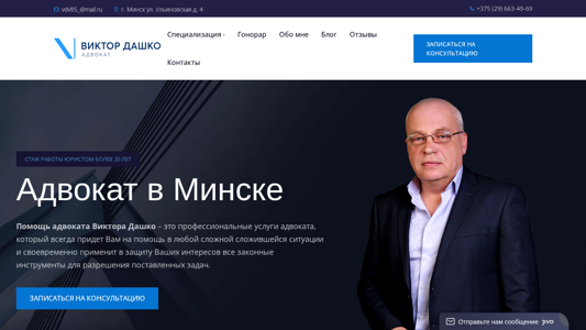 | AI-анализ | --- The website "Victor Dashko.by" is an advocacy service based in Minsk, Belarus. The site features a main navigation menu with various specializations of the law firm, including banking, civil, family, administrative, criminal, and consumer protection cases. The site also offers legal assistance for foreign citizens, as well as help with debt recovery, DTP (road traffic) cases, and the supervision of construction projects. The site provides contact information, including an email address and a phone number, and offers an option to schedule a consultation. The site's title is "Адвокат в Минске Виктор Дашко" (Advocate in Minsk Victor Dashko), and the keywords include "адвокат" (advocate), "делам" (cases), "минске" (Minsk), "дашко" (D |