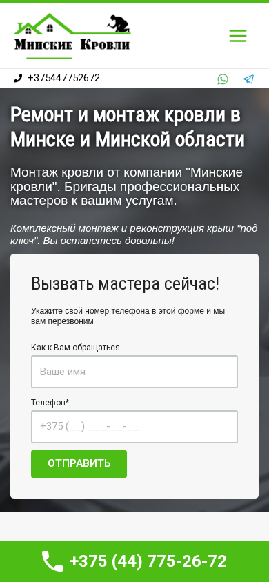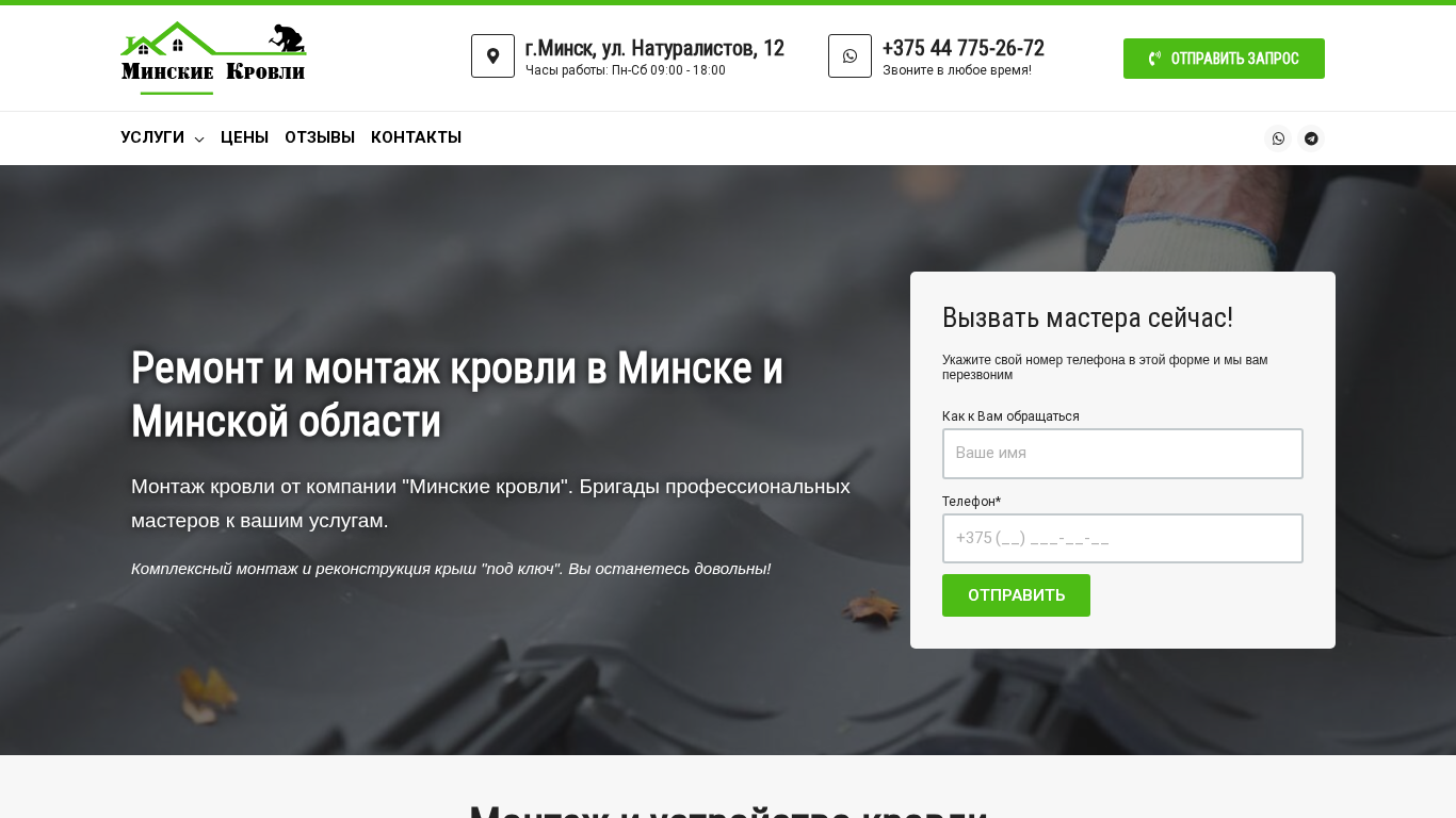 | SEO-описание | Монтаж кровли в Минске и области. Актуальные расценки на монтаж крыш и кровельные работы в 2025-2026 году, отзывы заказчиков, выезд на объект. |