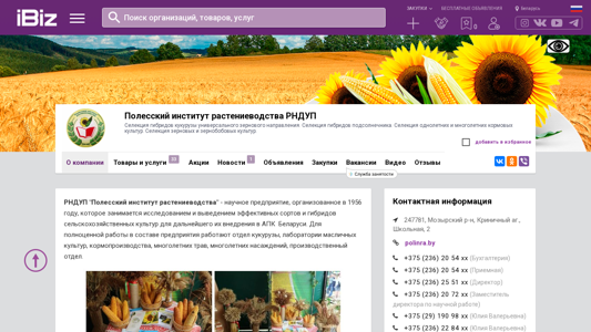 | Название / Заголовок | Полесский институт растениеводства РНДУП - Селекция гибридов кукурузы универсального зернового направления. Селекция гибридов подсолнечника. Селекция однолетних и многолетних кормовых культур. Селекция зерновых и зернобобовых культур.. 247781, , Криничный аг., Школьная, 2 |