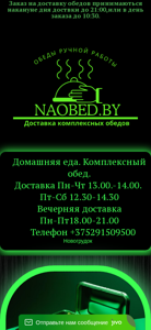 | AI-анализ | --- This online resource offers complex meals for delivery in Novogrudok, as well as homemade semi-finished products. Orders for meal delivery can be placed the day before or on the day of delivery before 10:30. The menu includes a complex meal for 10 rubles, and any dish from the menu can be ordered separately for 8 rubles. Delivery is available Monday through Friday from 13:00 to 14:00, and on Saturday from 12:30 to 14:30. Evening delivery is available Monday through Friday from 18:00 to 21:00. Semi-finished products, such as dumplings with meat and rice, dumplings with cabbage and mushrooms, lazy dumplings, lasagna, vegetable casserole with chicken filet, potato |