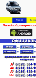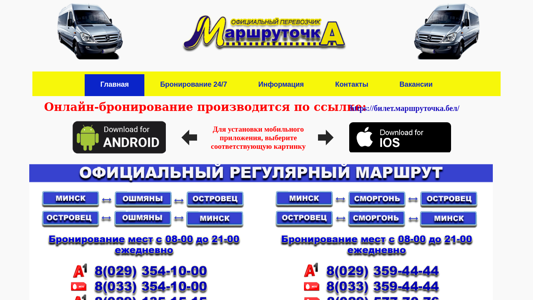 | AI-анализ | The web project "Marshrutka.by" is a transportation company website, focusing on bus routes between Minsk and Oshmyany-Ostrovec, and Minsk and Smorgon. The site offers 24/7 online ticket booking through a provided link. The company, "Marshrutochka," is the first official bus carrier operating on these routes, providing regular services with professional, experienced, and courteous drivers using Mercedes-Benz Sprinter buses. The buses ensure passenger safety and comfort, making them popular among various population groups. If you are in need of a comfortable and affordable bus ride between Oshmyany-Ostrovec and Minsk, or Smorgon and Minsk, this is the right place for you! The website displays bus schedules daily, with various stops listed, including engineering, hotel, vegetable market, and others. Bus schedules |