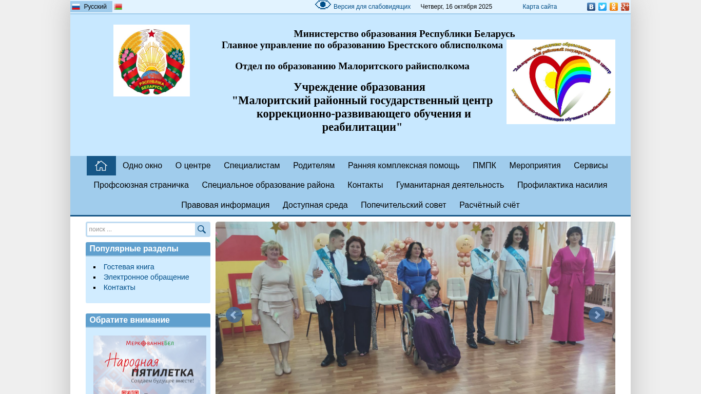 | AI-анализ | --- The website <mckroir.malorita.edu.by> is the homepage of the "Малоритский ЦКРОиР" (Minsk Oblast Regional Centre for Correctional-Developmental Education and Rehabilitation) in Malorita, Belarus. The website provides news and information about the centre, its mission, and various educational and rehabilitation programs for individuals with special educational needs. Keywords associated with the site include 'education', 'Belarus', 'region', 'district', and 'rehabilitation'. The site consists of various sections such as 'About the Centre', 'Services for Specialists and Parents', 'Early Comprehensive Help', 'Events', and 'Contact Information'. The homepage displays the latest news from the centre and the region, with articles on topics such as seminars for educ |