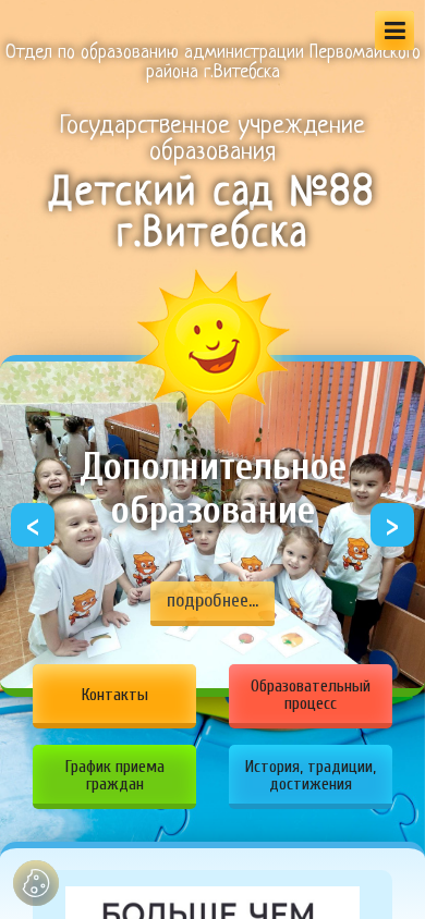 | AI-анализ | This website is for a kindergarten named "Detsky Sad #88 g.Vitebska" located in the city of Vitebsk, Belarus. The title and description include keywords related to the kindergarten, education, safety, news, and contacts. The top words suggest that the website contains information about the kindergarten's schedule, September, detailed information, the city of Vitebsk, safety, news, and contacts. The website likely provides information about the kindergarten's administration, educational network, leadership, and contact details. It may also offer information about the kindergarten's pedagogical team, conditions for enrollment, additional educational services, and social support. The website likely complies with local legal requirements and has a plan of work and budget report. It may offer electronic application procedures and have a rating portal. The website may provide information about the kindergarten |