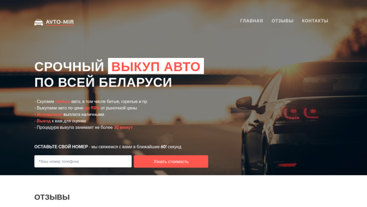 | AI-анализ | This online resource, titled "Срочный выкуп авто по всей Беларуси" (Quick Sale of Cars Across Belarus), is a website dedicated to purchasing vehicles across Belarus. The description mentions that it offers a quick sale with a free visit for evaluation. The website operates in all regions of Belarus, purchasing various types of vehicles including damaged ones. The pricing offered can reach up to 98% of the market value, with immediate cash payment upon deal completion. The website promises a swift process, taking no more than 30 minutes. Users can leave their phone numbers to be contacted within 60 seconds. The site includes customer reviews with high ratings, praising the promptness and professionalism of the service. The company has been active for over 15 years and has completed more than 600 deals in the car buying sector. They provide full legal support for all |