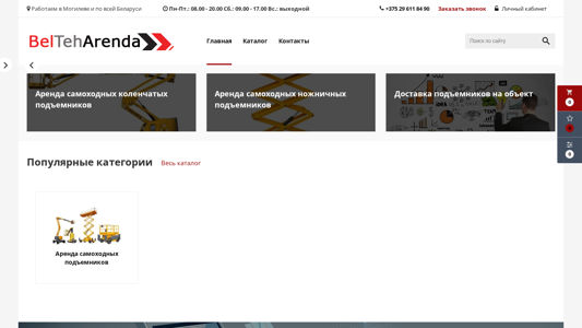 | AI-анализ | This online resource is a rental service for crane lifts based in Mogilev, Belarus, providing delivery throughout Belarus. The website offers both column lifts and scissor lifts for rent. Operating hours are Monday through Friday from 8:00 to 20:00 and Saturdays from 9:00 to 17:00, with Sundays being a day off. The website includes a personal cabinet for customers to place orders, contact information, and a catalog featuring self-propelled column lifts and self-propelled scissor lifts. Users can make a quick purchase with fields for name, contact phone number, and email address. The website is registered under the name of IP Mariina Mikhailovna and has the state registration number 790123928. The company "BelTechArena" |