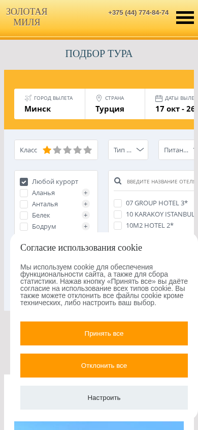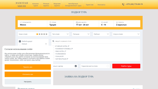 | AI-анализ | The website is a travel company called Золотая Миля (Golden Mile), offering various tours and accommodations in Turkey. The description mentions aviation, bus tours, and cruises, as well as holidays by the sea. The website includes sections for testimonials, booking and payment, insurance, and visa support. The company's contact information is provided, including a phone number. The website offers tours to multiple Turkish cities and resorts, such as Antalya, Alanya, and Marmaris, with various accommodation options ranging from 3-star to 5-star hotels. The website also includes articles and gift certificates. The domain is goldenmile.by. |