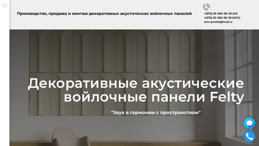 | AI-анализ | --- The web project Felty.by specializes in the production, sale, and installation of decorative acoustic felt panels. The site offers a wide range of affordable acoustic panels for walls, ceilings, and floors, with delivery available throughout Belarus. The contact details provided include phone numbers for local and MTS networks, as well as an email address and multiple social media channels. The site offers a form for inquiries, as well as an invitation to call or request a callback. Keywords associated with the project include various types and forms of acoustic panels, as well as the materials used and their benefits, such as modernity, eco-friendliness, durability, and easy installation. The site also emphasizes the anti-static and dust-free properties of the material, and the simplicity and affordability of installation. The site's primary content is focused on the production, sale, and installation |
