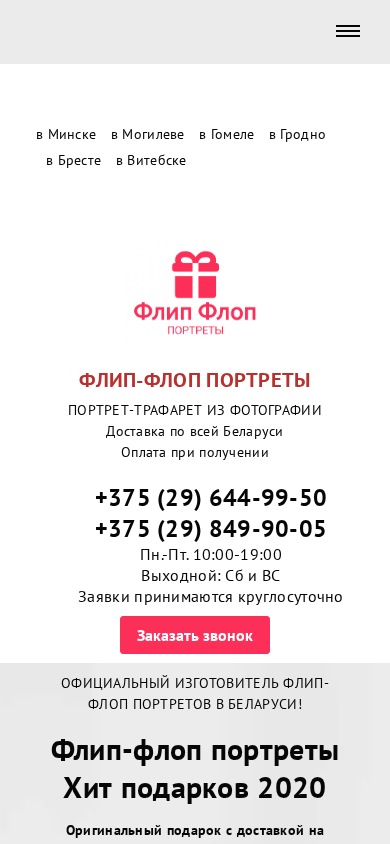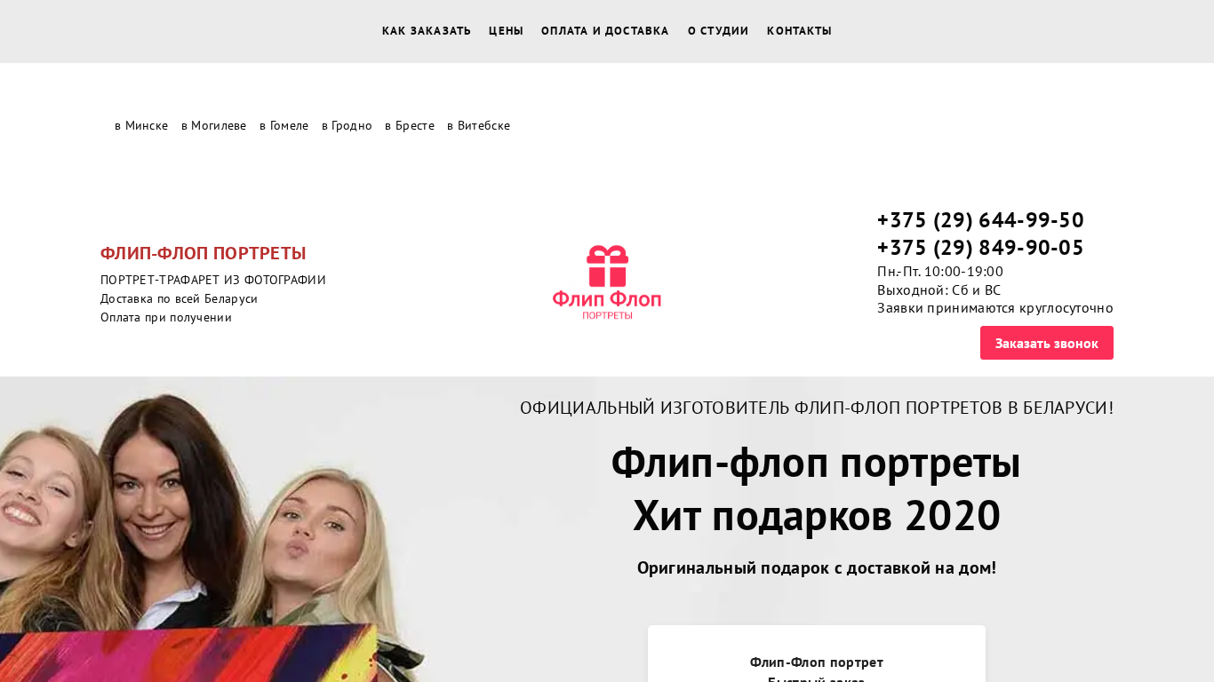 | SEO-описание | Флип Флоп портрет на заказ в Беларуси. Вы присылаете фотографию, мы вручную создаем иллюстрацию из вашей фотографии, вырезаем трафарет из пленки на режущем плоттере и наклеиваем его на холст. Комплектуем подарочным набором с кисточками и красуамм. Вы разрисовываете картину, наклеиваете специальную пленку и после отклеивания вы увидите картину из фото! |