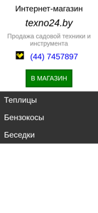 | AI-анализ | The portal texno24.by is an e-commerce website specializing in the sale of gardening equipment and tools. The title of the website is "Садовая техника со скидкой" which translates to "Gardening Equipment with Discounts." The description provides no further information. The website uses the keywords "садовая техника," which means "gardening equipment," and "техника," which means "technology" or "equipment," multiple times. Other top_words include "интернет-магазин" (online store), "продажа" (sale), "садовой" (gardening), "техники" (technology or equipment), "инструмента" (tools), and specific product types such as "теплицы" (greenhouses), "бензокосы" (gas |