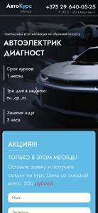 | AI-анализ | --- The website avtokurs.by is dedicated to providing "АВТОЭЛЕКТРИК ДИАГНОСТ" or autoelectric diagnostic courses in Minsk, Belarus. Users can contact the institution via multiple messaging platforms, including Tiktok, Instagram, Telegram, Viber, and Whatsapp, or by phone at +375 29 640-05-25 between 9:00-21:00 every day. The courses last for one month, with classes held three days a week on Mondays, Wednesdays, and Fridays from 18:00-21:00. The cost of the course is 500 rubles, and interested individuals can leave their application with their name and phone number to secure a discount. The courses are taught by experienced professionals |