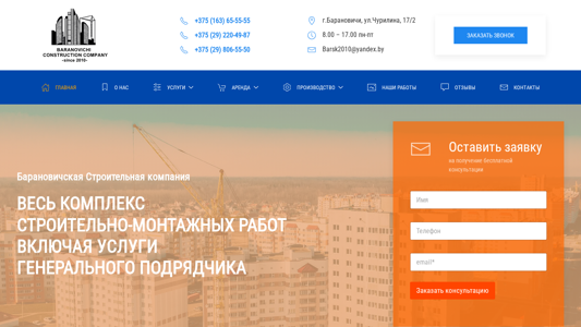| AI-анализ | The website is a construction and montage company based in Baranovichi, Belarus. The title of the website is "Строительно-монтажные работы" (Construction and Montage Works) and it provides a range of services including general contracting, construction of buildings and structures of various classes of complexity, installation of internal and external heating, water, and electrical systems, and ventilation and air conditioning systems. The website also offers equipment and tool rentals for construction projects. The company's contact information is listed, including multiple phone numbers and an email address. The website is located at barsk.by. |