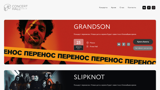 | AI-анализ | This website, titled "Ближайшие концерты - Концертное агенство Concert Hall Group" (English: "Latest Concerts - Concert Agency Concert Hall Group"), is dedicated to providing information about upcoming concerts in Minsk, Belarus. The data reveals that the website includes sections for the concert archive, about the agency, and contacts. Two specific concerts are highlighted, one featuring Grandson with a postponed date to be announced, and another for Slipknot also with a pending new date. The agency's contact information, address, and Unified State Register of Enterprises number are provided. The website is protected by copyright from 2008 to 2025. |
