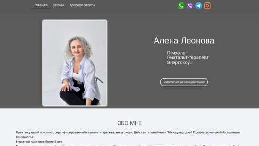 | AI-анализ | This website belongs to psychologist and certified Gestalt therapist Alena Leonova, who also practices as an energy coach. With over 5 years of experience in private practice, she helps clients recognize and process unresolved feelings, understand their needs, and find inner resources and support. Her approach emphasizes safety, respect for individual choices and perspectives, and equal responsibility for therapy outcomes. Common issues she addresses include inner conflicts, difficulties in relationships, financial disputes, and personal crises. Keywords related to her work include self, not, sign up, consultation, yours, self-understanding, energy, life, desires, needs, fear, motivation, coach, therapist, Gestalt. The top words on the site are "self," "not," "sign up," "consultation," "yours," "self," "Leonova," "own," "needs," "therapy," "yourself," "under |