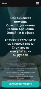 | AI-анализ | This website is for a law firm named "Урист Могилеве - Щанникова Жанна Ароновна" located in Mogilev, Belarus. The website offers online and offline legal services. The title of the website is "Юрист в Могилеве - Щанникова Жанна Ароновна | Онлайн и в офисе" which translates to "Lawyer in Mogilev - Щанникова Жанна Аroновna | Online and in the Office". The description in the metadata provides contact information, including a phone number "+375296925165" and an alternative number "+375333977768". The keywords indicate that the website deals with legal consultations and document preparation, as well as disputes and litigation. Services |