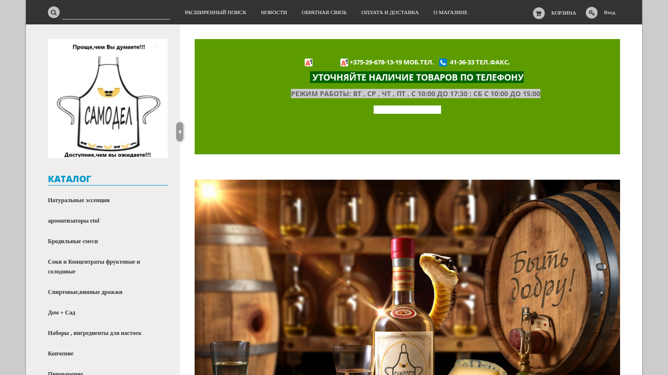 | AI-анализ | type: commerce The portal Samodel.by is an e-commerce website selling various products. The title and description of the website are 'САМОДЕЛ - Интернет магазин'. The website's top_words include 'оформить' (31 occurrences), 'цена' (30), 'корзину' (30), 'руб' (28), 'previous' and 'next' (13 each), 'дрожжи' (9), 'адреса' (8), 'набор' (7), 'поля' (6), 'спиртовые' and 'винные' (6 each), 'приготовления' (6), 'формы' (4), 'все' (4), 'доставка' (4), 'уточняйте |
