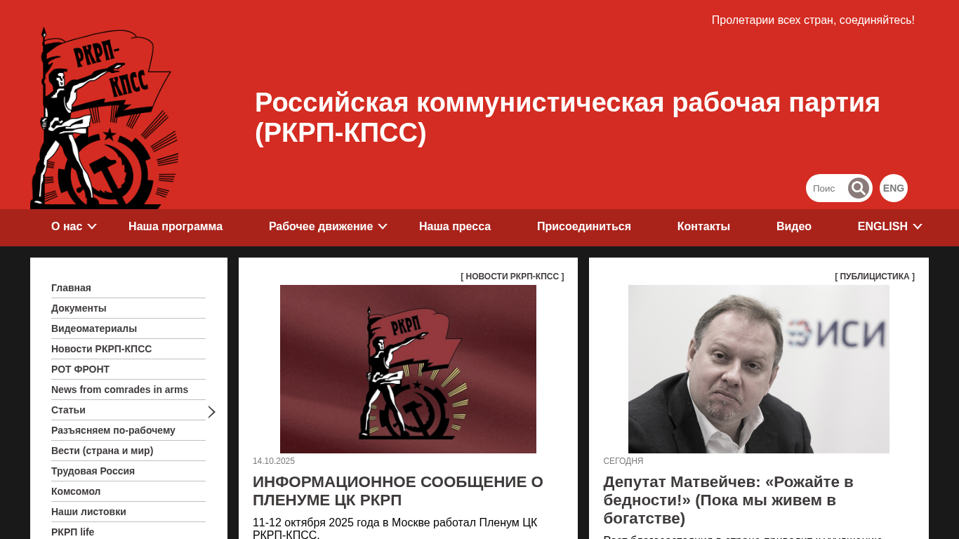 | AI-анализ | The web project "Российская коммунистическая рабочая партия (РКРП-КПСС) – Пролетарии всех стран, соединяйтесь!" is a Russian Communist Labor Party website. The site provides information about the party, its history, leaders, publications, programs, and work movements in various countries. It features articles, news, and information materials from comrades in arms. The site also includes links to documents, videos, and archives. The party's newspaper, "Мысль," is mentioned, with an announcement for its 10th issue of 2025. Additionally, there is a mention of a University of Workers Correspondents and a plenary session of the Central Committee of the party held in Moscow in October 2025. The site also contains various statements and articles on topics such |