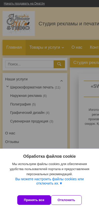 | AI-анализ | The web project "Production of outdoor advertising in Minsk from Sw-Studio" is a website for a printing and advertising studio located in Minsk, Belarus. The studio offers production of outdoor advertising and wide format printing for businesses. Customers can place orders by phone at +375 (29) 672-52-89. The studio produces outdoor advertising signs and light boxes. Pricing information for all services is to be confirmed by contacting the studio. Other services offered include offset and digital printing, graphic design, development and design of exhibition stands, and interior wide format printing on self-adhesive film. The studio's website was created on the Deal.by platform. |