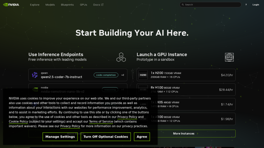| AI-анализ | The portal "Try NVIDIA NIM APIs" is a website dedicated to enabling users to explore and utilize NVIDIA's leading models for building enterprise generative AI applications. The homepage invites visitors to start building their AI projects, offering free inference with various models, including Blueprints, GPUs, and Docs. Users can choose from different instance types, such as H200, H100, L40S, and A100, each with varying specifications and prices per hour. Additionally, the portal provides access to a Blueprint Collection, which offers workflows and code samples to help users build AI applications from the ground up. The website also includes Terms of Use, Privacy Policy, and a Contact section for users to manage their privacy choices and get in touch with NVIDIA. NVIDIA uses cookies to improve user experience and collect interaction data for performance improvement, analytics, |