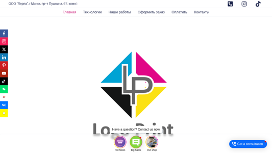 | AI-анализ | The portal Logoprint.by is a business website based in Minsk, Belarus, offering various printing services. The title of the website is "Полиграфические услуги в Минске" (Poligraficheskie uslugi v Minske), which translates to "Printing services in Minsk". The description provides keywords related to the business such as "контакты" (contacts) and "полиграфические услуги" (printing services). The website also mentions specific services like "технологии" (technologies) and "наши работы" (our works). Users can get a consultation and place an order, and the website offers a special promotion with a countdown timer. The business is located at пр-т Пушкина, 67. комн.1 (pr-t Pushkina, |