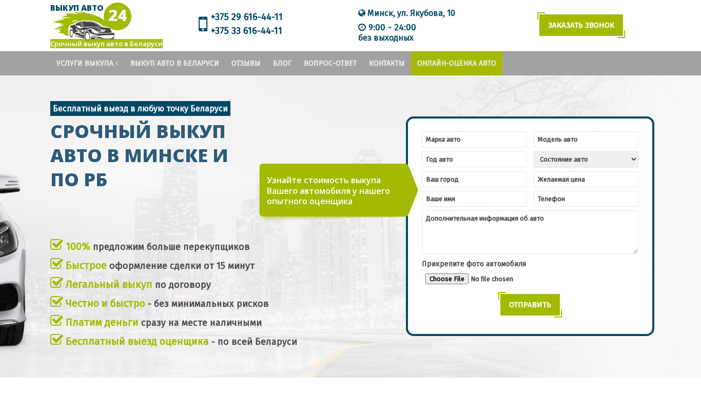 | SEO-описание | ⭐⭐⭐⭐⭐ Срочный выкуп авто в Минске до 96% от рыночной стоимости - 🚗 срочно продать автомобиль в нашем авто выкупе - 🚨 скупка авто по всей Беларуси в компании Выкуп авто 24 - ⭐🔥⭐ битых, аварийных, проблемных автомобилей |