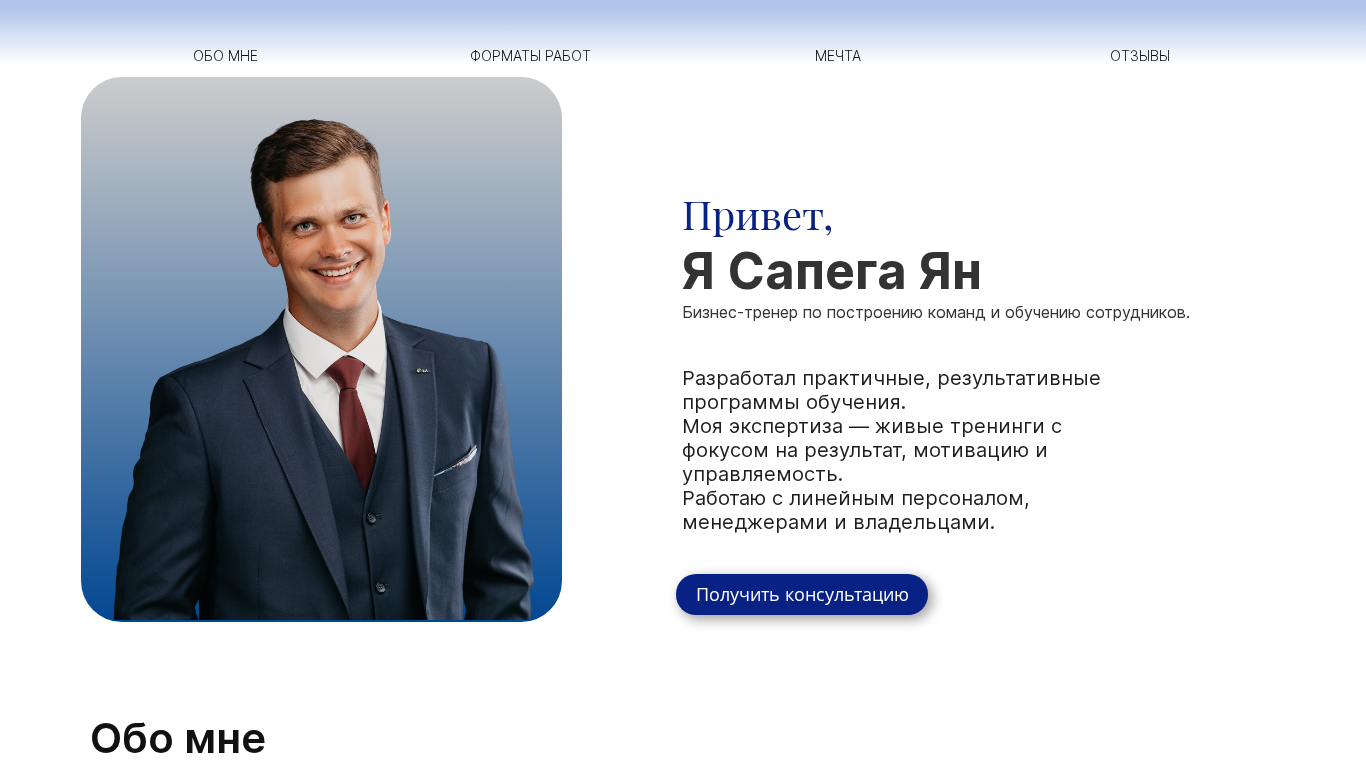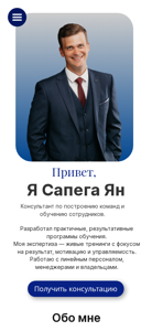 | AI-анализ | This online resource, titled "Ян Сапега" (yan sapega), is a business training and consultation website. The description states that the creator has developed practical and effective education programs. The focus of the expertise is on live trainings with a result-oriented, motivational, and controllable approach. The target audience includes linear personnel, managers, and business owners. The website includes sections on the trainer, formats of work, personal achievements, testimonials, and contact information. The trainer, Yan Sapega, shares his experience in growing a housing project called "Жилищный баланс" (жилищный баланс), where he was involved in opening offices nationwide, hiring and training staff, managing, and implementing a quality control department. This led to a doubling of sales in the first year. He then built a system for regular management, including regulations, reporting, planning, and motivation |