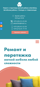 | AI-анализ | The website is a furniture repair service based in Vitebsk, Belarus. It offers repair and reupholstery of soft furniture such as sofas and chairs for prices starting from 4.9 rubles. The repair service includes a six-month guarantee. Keywords related to the website include 'repair', 'reupholstery', 'sofa', 'chair', 'price', and 'guarantee'. The website also mentions the availability of 'actions' and 'discounts'. The contact information provided includes phone numbers and an email address. Services offered include repair and reupholstery of various types of furniture, including kitchen and bar stools, poufs, and transformable chairs. The website also mentions the availability of a 'workshop' section with 'reviews' and 'contacts'. |