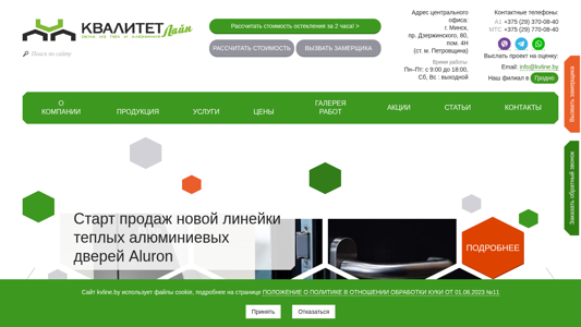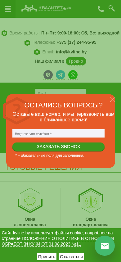 | AI-анализ | --- The portal provides information on the production and sale of PVC windows in Minsk, offering custom orders. Customers can buy PVC windows from the manufacturer at optimal prices with quality guarantees. The website offers delivery and provides a contact number for inquiries and orders. The company also has an office address and working hours. Various window and door products, as well as related services, are advertised on the portal, including installation, lamination, and toning. The website also mentions a filial in Grodno and contact information for the company. The portal appears to offer financing options and a calculator for estimating window costs. The site includes sections on the company, news, production, testimonials, and contacts. |