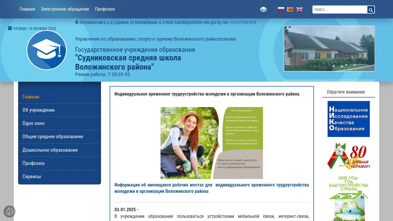 | Адрес | ул.Молодёжная, 4, e-mail: sudniki@volozhin-edu.gov.by, тел. |