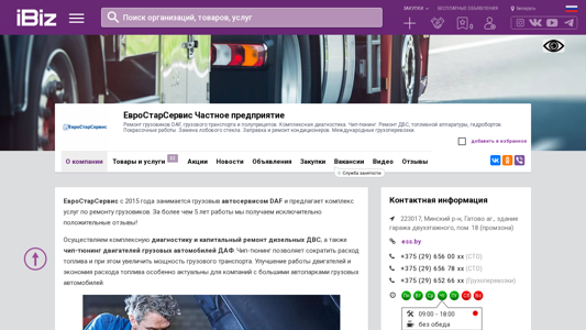 | Название / Заголовок | ЕвроСтарСервис Частное предприятие - Ремонт грузовиков DAF, грузового транспорта и полуприцепов. Комплексная диагностика. Чип-тюнинг. Ремонт ДВС, топливной аппаратуры, гидробортов. Покрасочные работы. Замена лобового стекла. Заправка и ремонт кондиционеров. Международные грузоперевозки.. 223017, , Гатово аг., здание гаража двухэтажного, пом. 18 (промзона) |