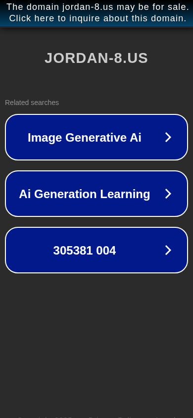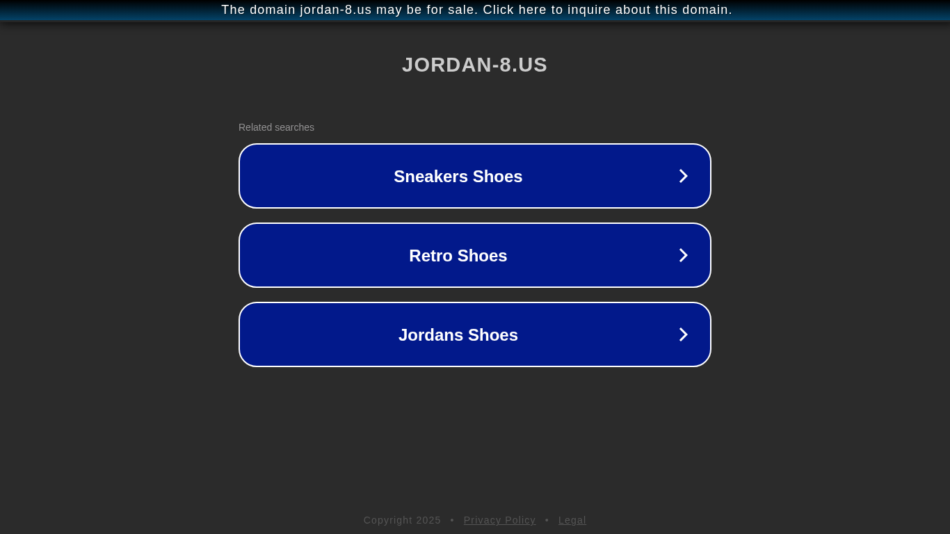 | AI-анализ | This website, jordan-8.us, may be for sale, as indicated by the message "Click here to inquire about this domain." The website's title and description do not provide any information about the content of the site. The top keywords for this domain include "jordan-8," "domain," "may," "sale," and various terms related to legal and privacy policies. The domain is registered to the year 2025. |