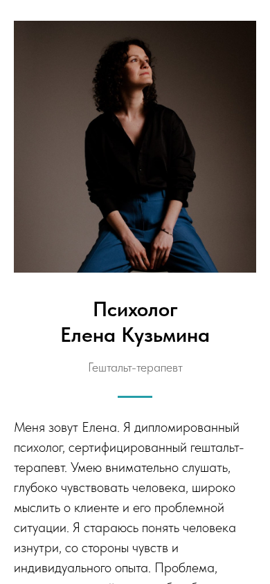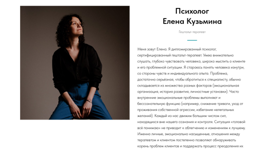 | AI-анализ | The website <www.kuzmina.by> is a personal website of psychologist and certified Gestalt therapist Elena Kuzmina located in Mogilev, Belarus. The website's title is "Психолог гештальт-терапевт Елена Кузьмина" (Psychologist Gestalt-therapist Elena Kuzmina). The description includes keywords such as "psychologist," "therapist," and "Mogilev." The most frequently used words are "works" (8), "you" (7), "Mogilev" (5), "psychologist" (4), "Elena" (4), "request" (4), "meetings" (4), "it" (4), "geштальт-терапевт" (3), "Kuzmina" (3), |