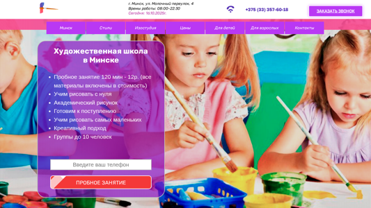 | AI-анализ | --- This website is for the art studio "Мольберт" located in Minsk, Belarus. It offers artistic education for both children and adults through various master-classes in painting, drawing, and other art forms. The studio encourages creativity and self-expression without rigid frames, welcoming participants at all skill levels. Master-classes range from aquarel to oil painting, sketching to abstraction, and can be held on birthdays or as corporate events. The studio also offers preparatory courses and individual lessons. The website includes information on prices, schedules, and contacts. |