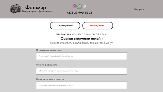 | AI-анализ | The web project "Скупка и выкуп фототехники" (Photomir) is a Belarusian website that offers a quick buyback service for contemporary photo technology. Users can sell cameras, lenses, and flashes from brands like Canon, Nikon, Sony, Fujifilm, Panasonic, and Olympus. The site provides an online valuation tool for users to estimate the worth of their equipment within five minutes. The full range of products accepted for purchase includes digital single-lens reflex cameras, digital rangefinders, some digital cameras, lenses, flash units, sync units, tripods, and other liquid photo and video equipment, as well as certain models of film-based cameras and lenses. The website does not buy stolen, found, or other people's items. It also does not accept damaged or faulty equipment or accessories, except in rare |