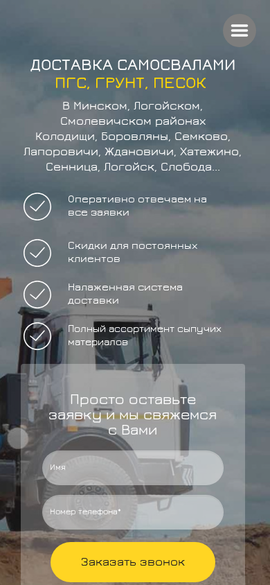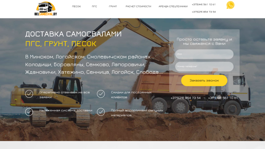 | AI-анализ | The portal offers for sale and delivery - building sand, carrier sand, seeding sand, PGS, soil, and others. Quick delivery! Quick delivery and unloading where needed! Phone numbers: +375(29) 854 73 54, +375(44) 561 10 61. Delivery of sand, PGS, and gravel in Minsk, Logoysk, Smarhom, Kolodishchi, Borovlyany, Semkovo, Laporoichi, Zhdanovichi, Hatizhno, Sennica, Lohisk, and Sloboda... Operational response to all requests. Discounts for regular customers. A well-established delivery system. A full range of dry materials. Simply leave a request and we will contact you. Name Surname Phone * Place |