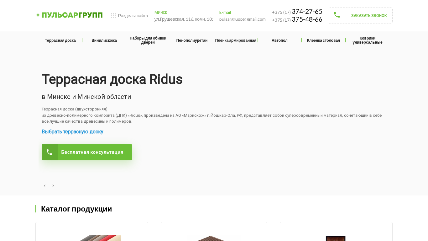 | Ключевые слова | Пульсаргрупп производство Винилискожа Кожзам Мебельная Галантерейная Поролон Клеёнка столовая ДПК Террасная доска Плёнка армированная Автопол автолин Искусственная кожа Коврики Купить недорого в Минске Оптом Набор для обивки дверей |