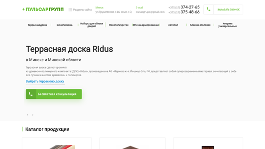 | AI-анализ | This online resource, titled "ПульсарГрупп" (PulsarGroup), offers the sale of vinyl coverings and sets for door covering in various industries. The extensive product range includes vinyl coverings suitable for manufacturing and repairing furniture in medical institutions, offices, bars, restaurants, footwear production, retail items, and clothing details, as well as for producing sports equipment and automotive upholstery. The website provides sections for "Автопол" (AutoPol), "Винилискожа" (Vinyl Covering), "Клеёнка столовая" (Table Cover), "Наборы для обивки дверей" (Sets for Door Covering), "Пенополиуретан" (Polyurethane Foam), "Плёнка армированная" (Aramid Film), "Террасная |