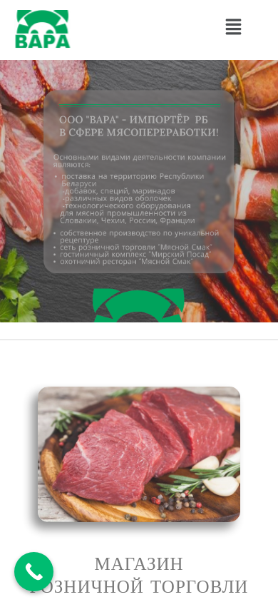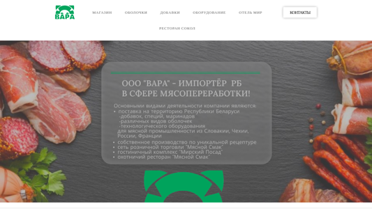 | AI-анализ | --- This online resource is a Belarusian e-commerce website for a company named "ВАРА." The site offers a range of products and services, including a retail store named "мЯСНОЙ СМАК," a catalog of packaging and printing services, and imports of technological additives and spices for meat and sausage products. The company has been a leading importer of packaging for these products in Belarus for many years. Additionally, the site mentions a "мирский посад" or "worldly marketplace," suggesting a potential lodging and dining option. Keywords include "ВАРА," "международные добавки," "оболочки," "специи," "оборудование," and "мясной промышленности." Top words are "подробнее," "меню," "обору |