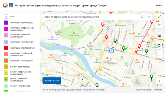 | AI-анализ | This online resource, titled "Интерактивная карта раскопок Гродно" (Interactive Map of Excavations in Grodno), provides an interactive map displaying the locations and statuses of various excavation projects in the city of Grodno. The map includes layers for different types of excavation work such as water, sewage, gas, electricity, and heat infrastructure. Users can filter the map to show completed, incomplete, or extended excavation projects, as well as view the map in various modes including satellite, hybrid, and panoramic views. The map is developed and maintained by "Гродненское городское жилищно-коммунальное хозяйство" (Grodno City Housing and Communal Services) and can be accessed via the domain raskopki.by. The site is also developed by ArtisMedia. |