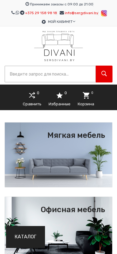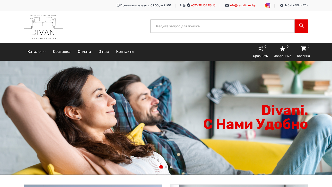 | SEO-описание | Интернет-магазин мебели Divani 🛋 Бесплатная доставка ✈ по Минску → Звоните +375 29 158 98 18 → Пишите info@sergdivani.by → Ждем! |