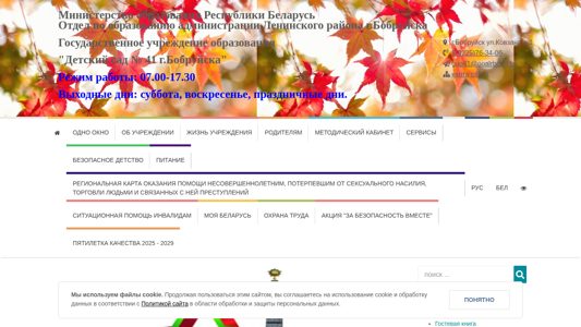 | AI-анализ | The website is a government educational institution for preschool children located in Bobruysk, Belarus. The title of the website is "Детский сад № 41 г.Бобруйска" (Preschool #41 in the city of Bobruysk). The website is operated by the Ministry of Education of the Republic of Belarus and the Administration of the Leninsky District of Bobruysk City. The institution is called "Государственное учреждение образования "Детский сад № 41 г.Бобруйска"" (State Educational Institution "Preschool #41 in the city of Bobruysk"). The website provides information about the institution's schedule, which runs from 7:00 AM to 5:30 PM, and lists the days off, which include Saturdays, Sundays, and holidays |